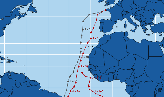 La position sur la carte est définie à partir d'un point établi à heure fixe et transmis quotidiennement par VDH. A défaut de transmission ce point pourra être déterminé par les relevés Argos. Jean Luc Van Den Heede a tracé une route théorique et fixé arbitrairement des points de passage qui permettent de déterminer la distance parcourue en 24h et la distance restant à parcourir. VDH calcule lui-même quotidiennement l'écart en jour entre sa position et celle de Philippe Monnet.